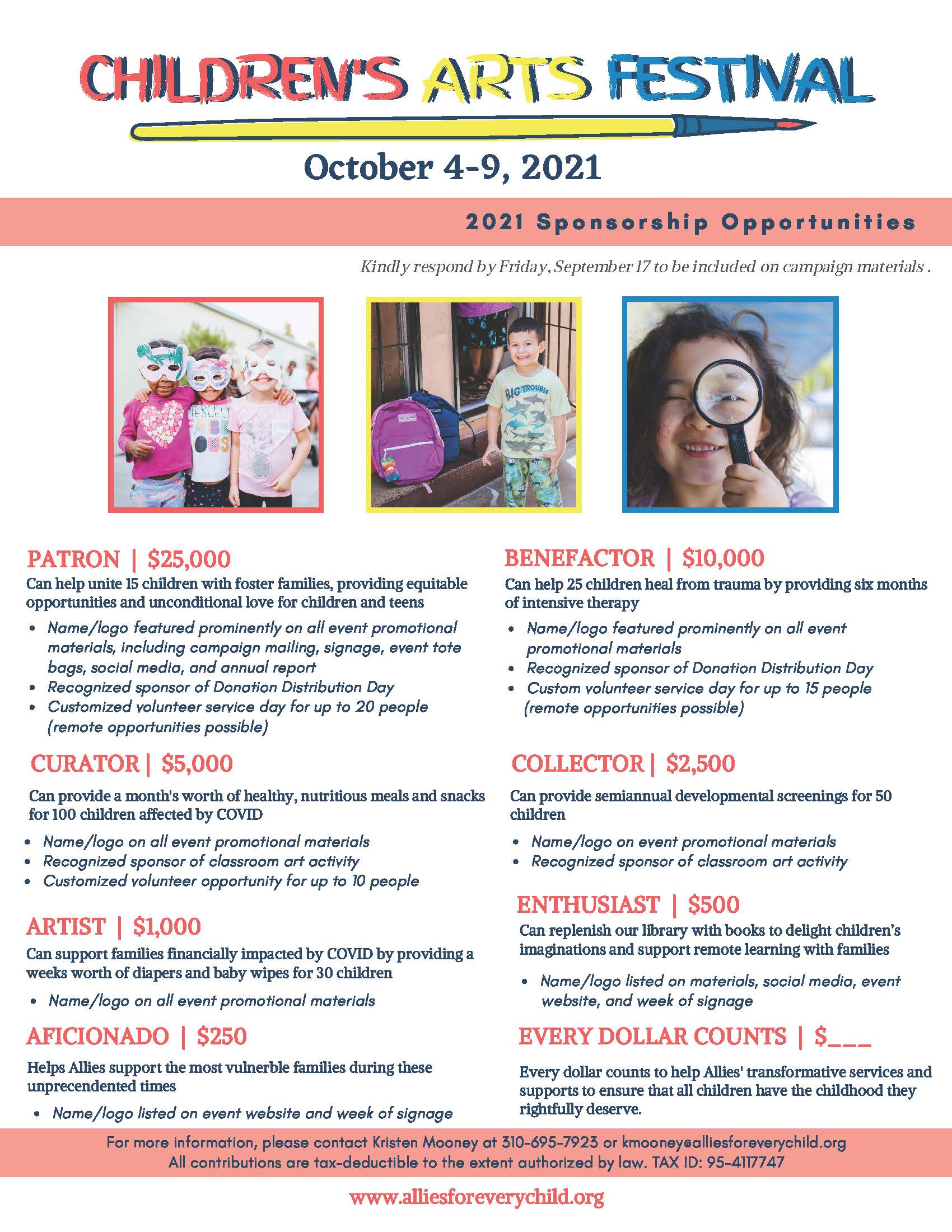 2021 marks the event’s 28th year, and though COVID-19 has forced us to change our usual event plans, the essence of Children’s Arts Festival will live on. Throughout the COVID pandemic Allies has increased our services to help families combat the financial and emotional toll COVID continues to take. We have distributed hundreds of thousands of meals and thousands of pounds of produce since March 2020. Your gift to Children’s Arts Festival allows Allies to continue this vital relief work, ensuring that every child feels supported, cared for, and loved. Allies additional programs and services have also never been more important – from foster care and adoption, mental health services, high-quality early education, and so many crucial integrated services in between – our work is tailored to meet the individual needs of children and families who face immense challenges, including abuse and neglect, homelessness, domestic violence, etc. For more information on what your sponsorship can make possible, please see the below Sponsorship Opportunities.